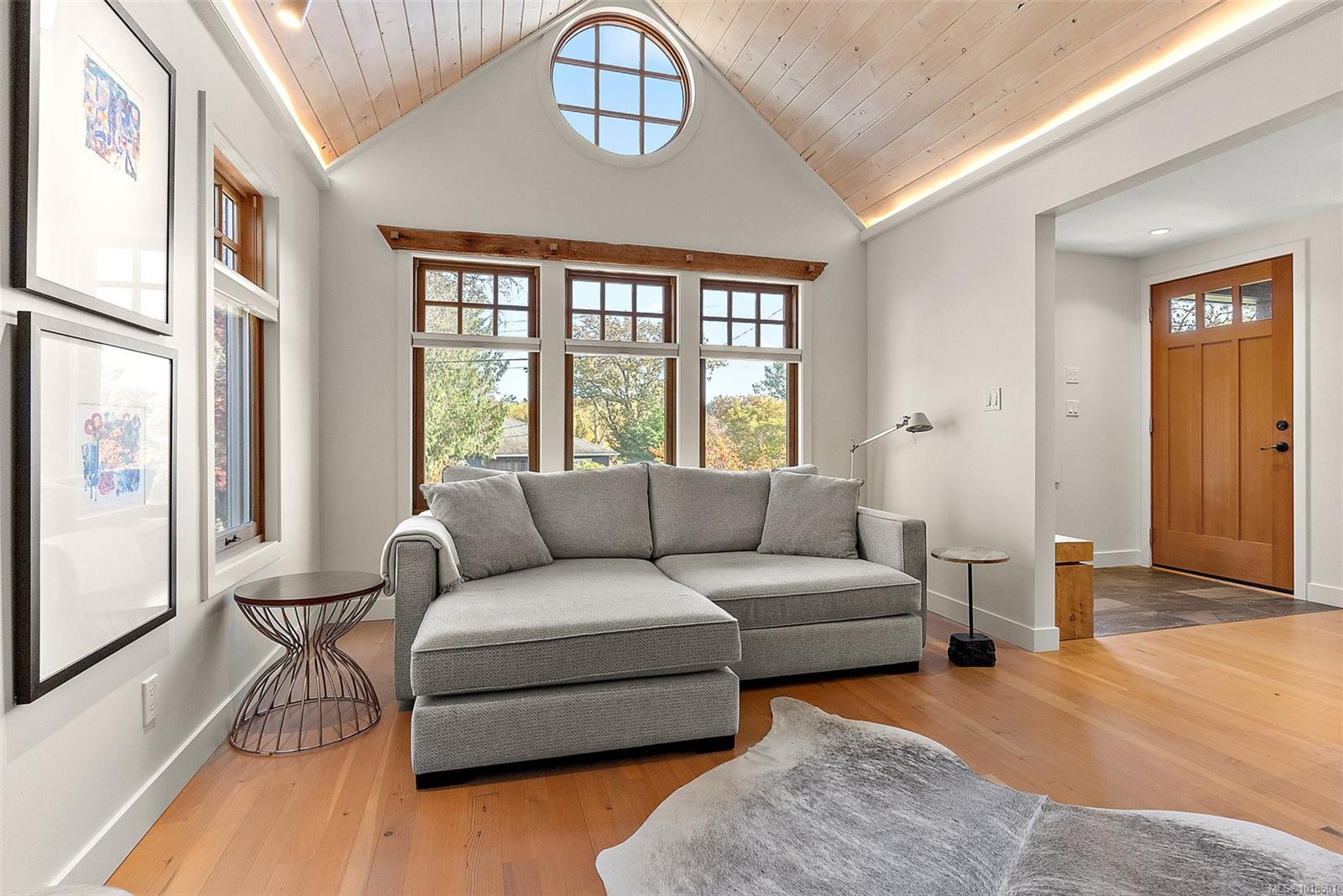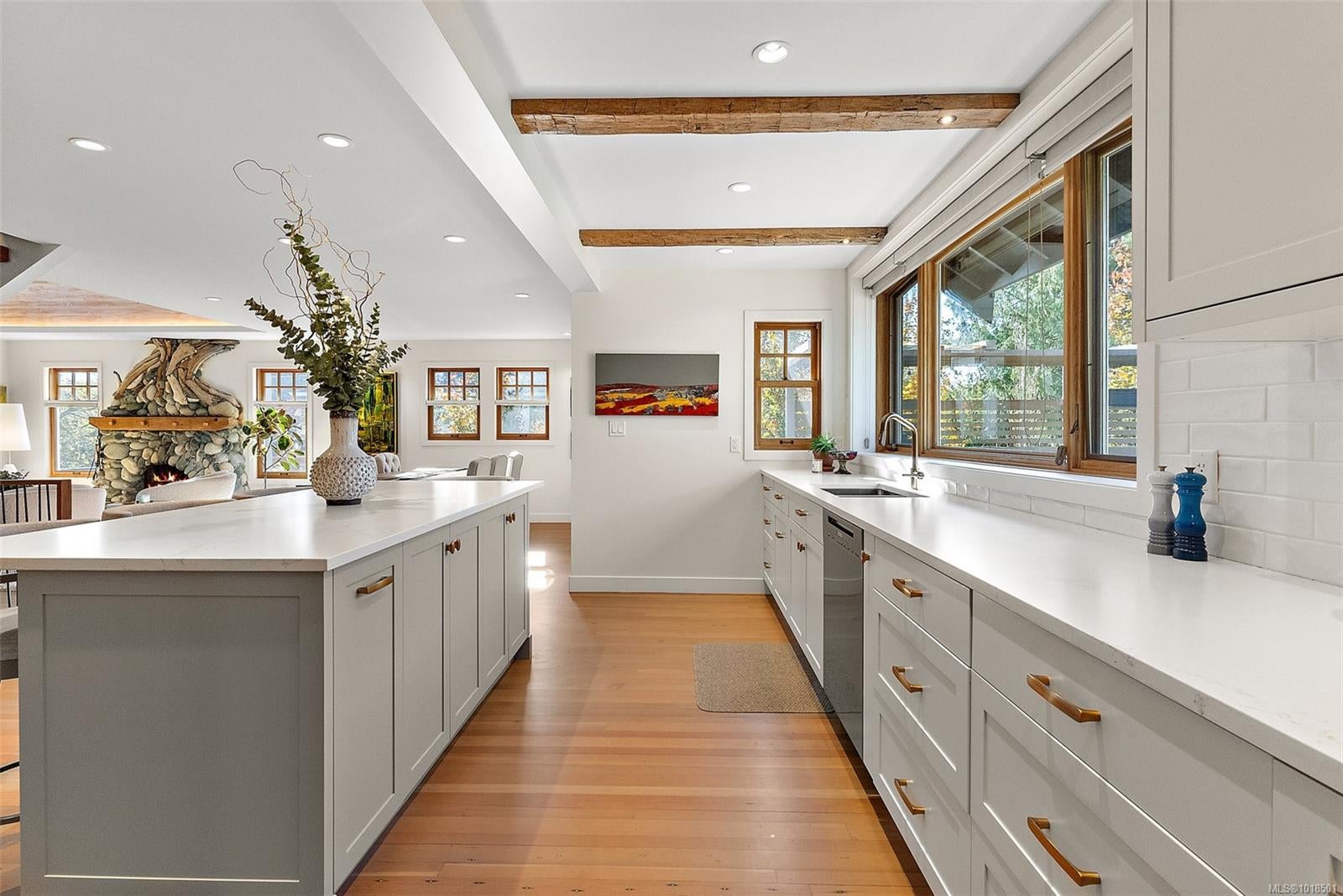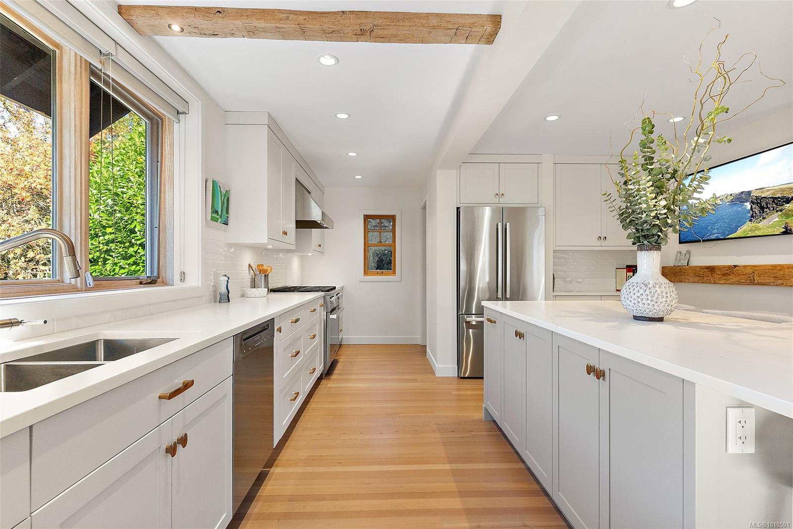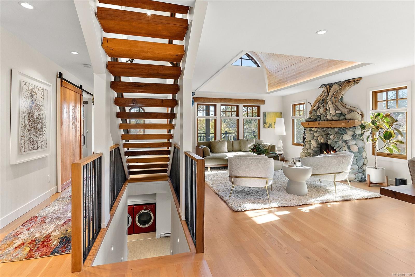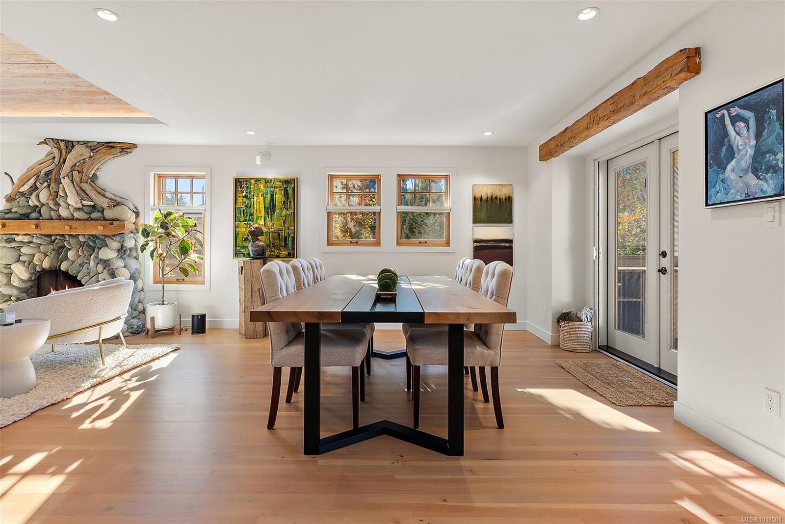 Gorgeous Executive Home in South Oak Bay. Set on a quiet, tree-lined street steps from the beach, this home has been completely reimagined with exceptional artistry and modern luxury. Highlights include a custom fireplace by Michael Eckerman of Eckerman Studios in California, 200-year-old Pennsylvania oak beams, a barrel-vaulted ceiling, and a statement staircase with cedar from Haida Gwaii. Designed for refined living and effortless entertaining, the main level offers bright open spaces and a new chef’s kitchen with premium Miele appliances. 2022 upgrades included electrical, hot water on demand, radiant in-floor heating systems, and A/C in the primary suite. Upstairs, the private primary retreat features a spa-inspired ensuite, walk-in closet with 2nd laundry, and secluded deck. The lower level offers a cosy media room and additional bedrooms. The west-facing yard includes a large deck, and hot tub — perfect for relaxing or entertaining. South Oak Bay living at its finest.